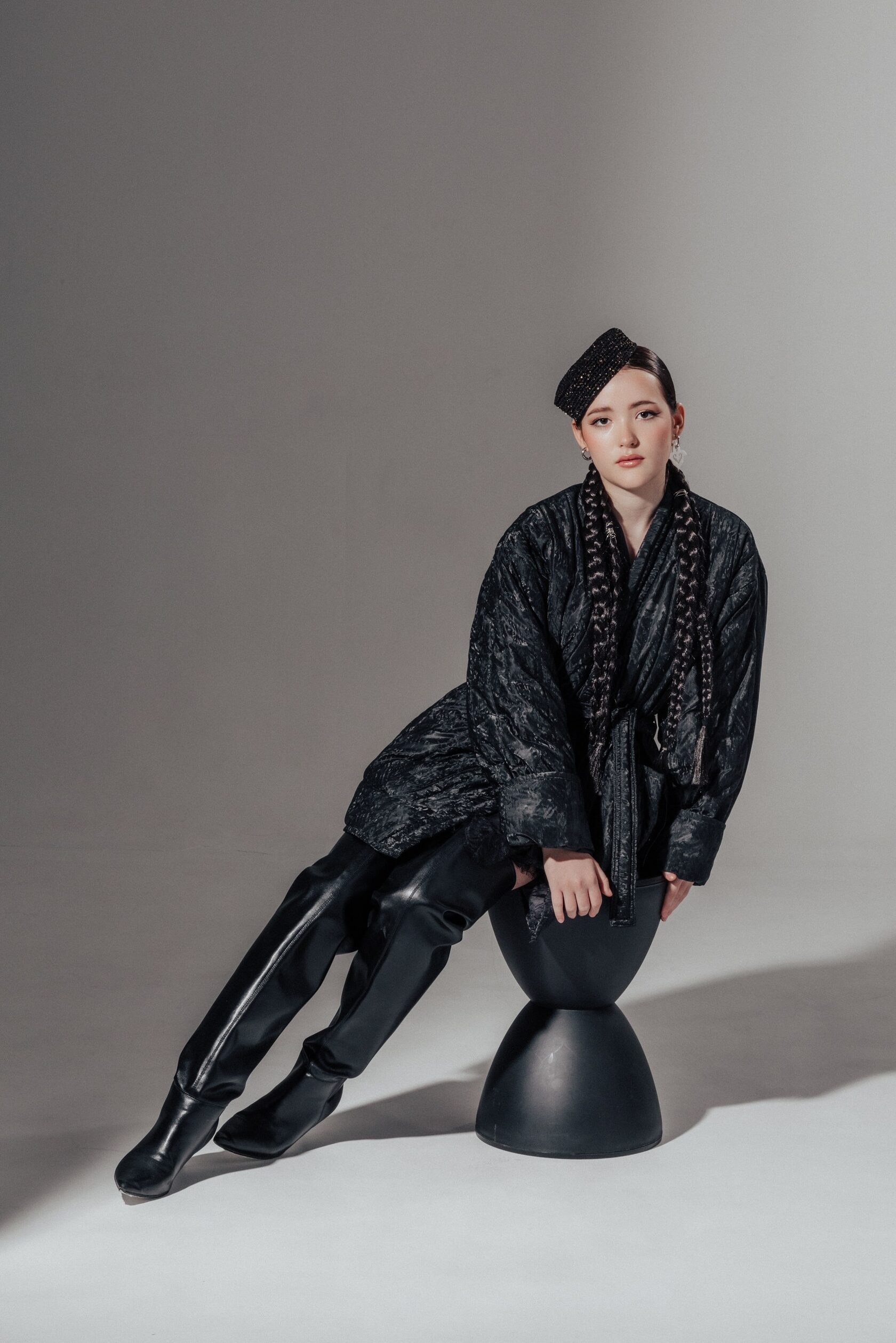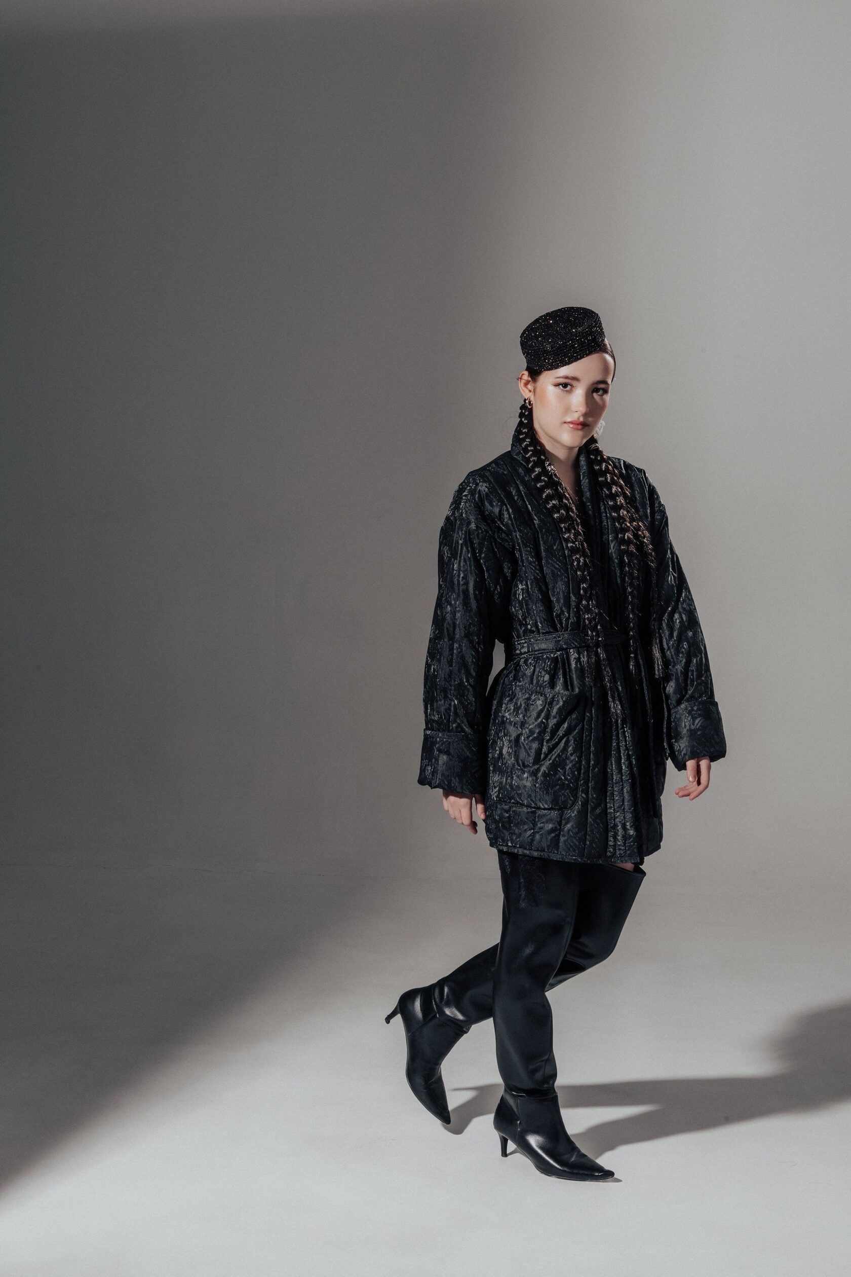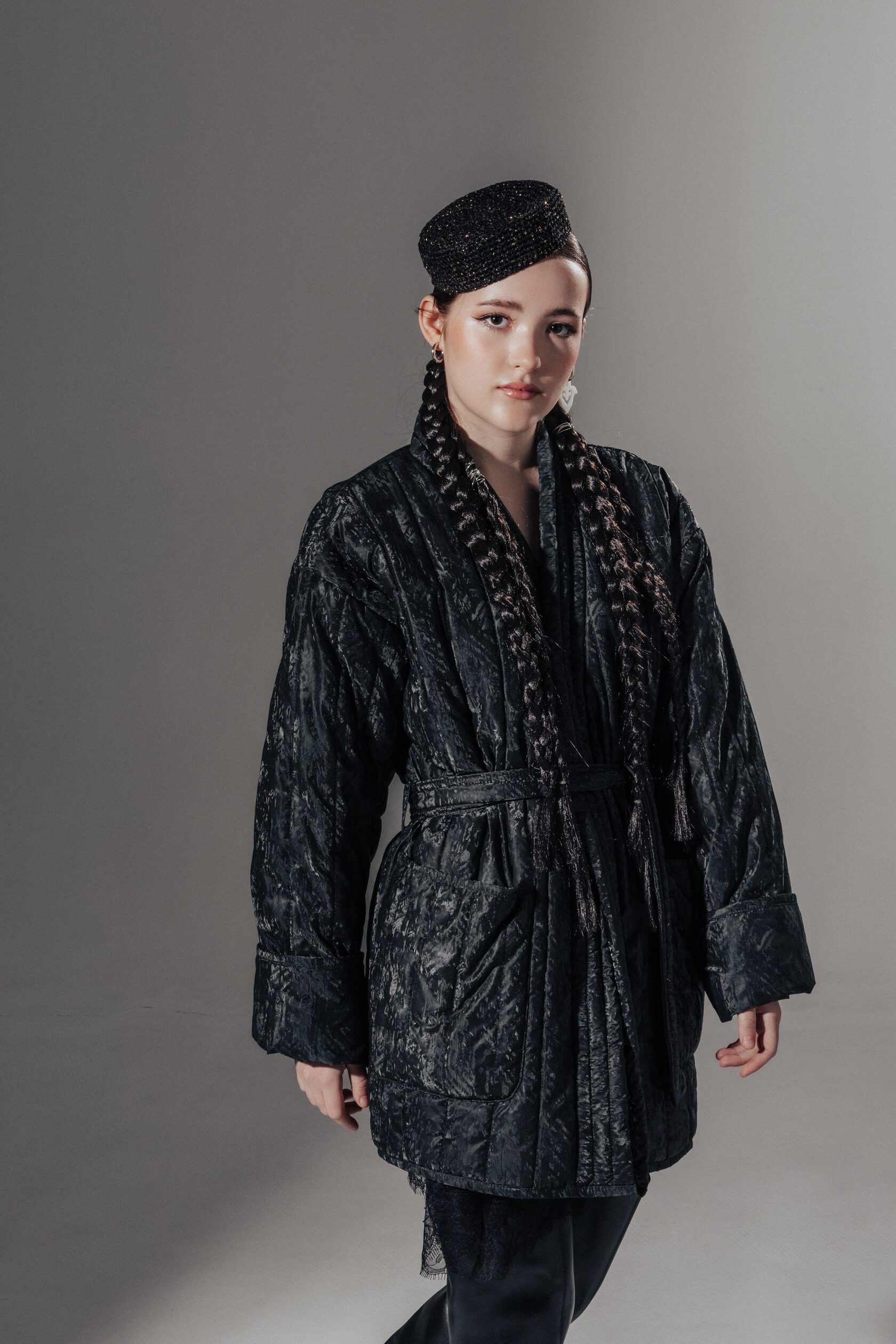 Благодаря свободному силуэту чапан удобно носить даже с объемным свитером.