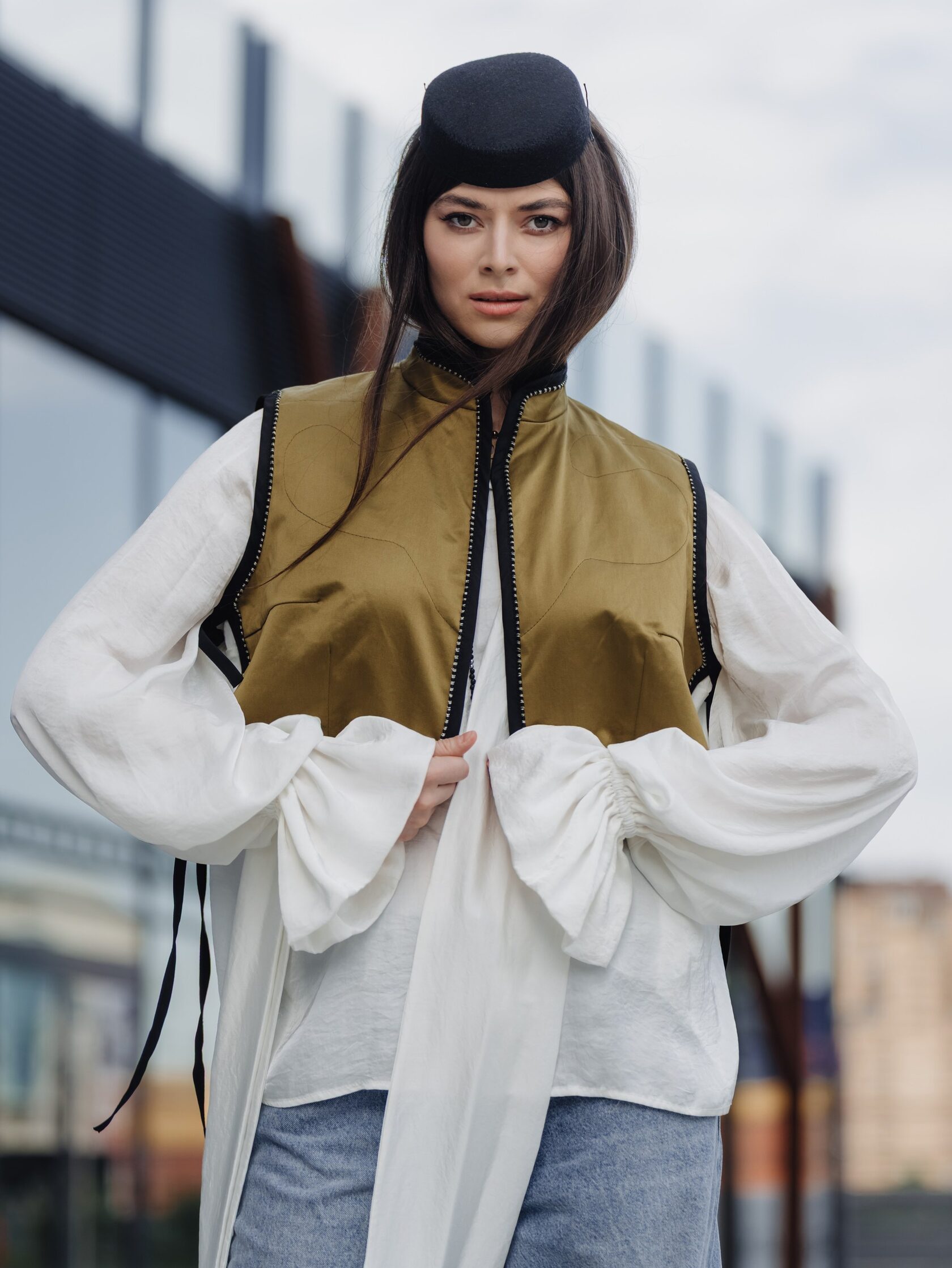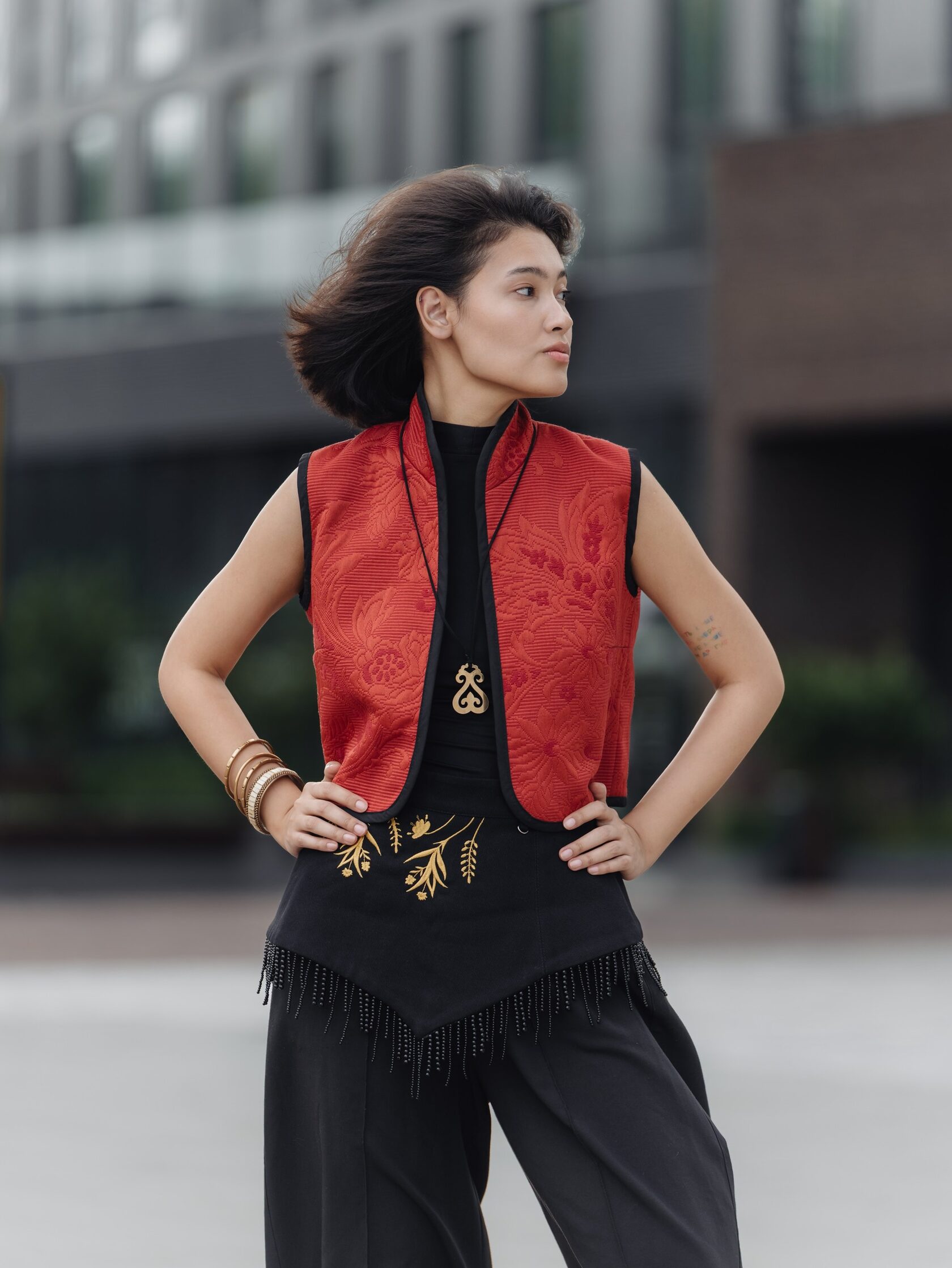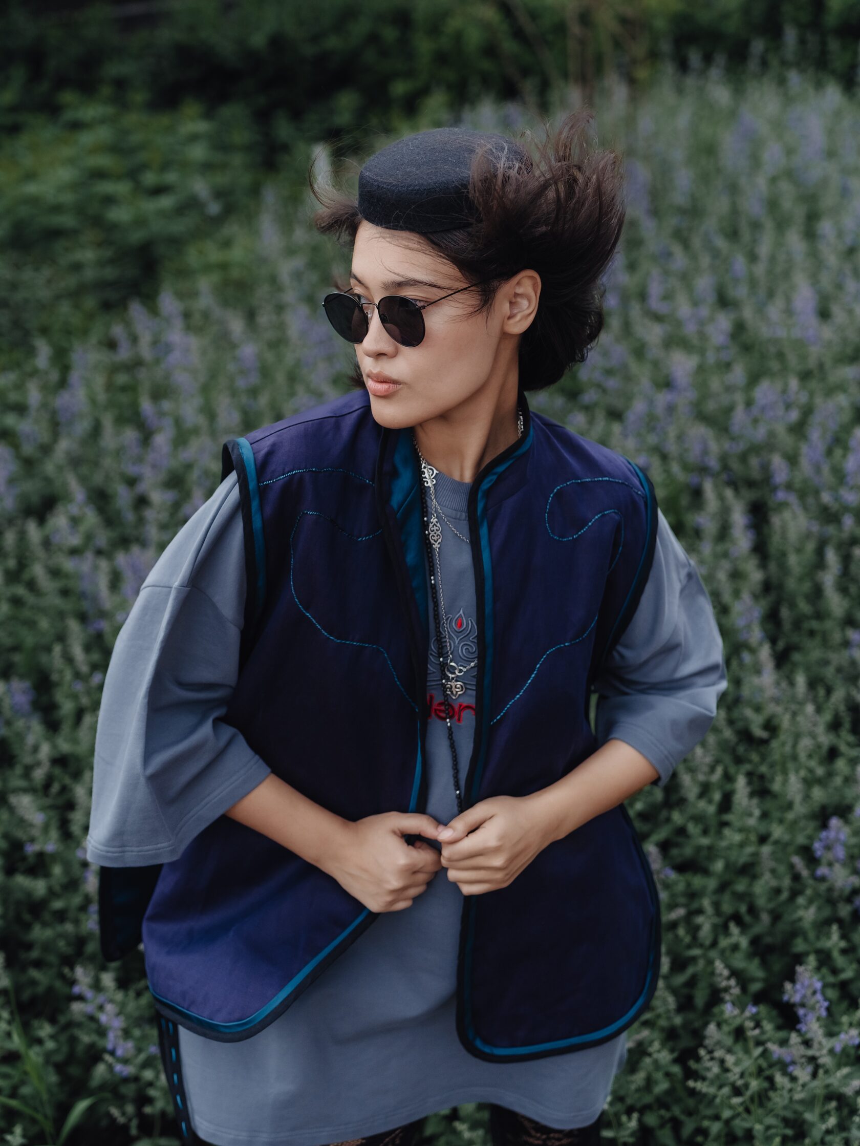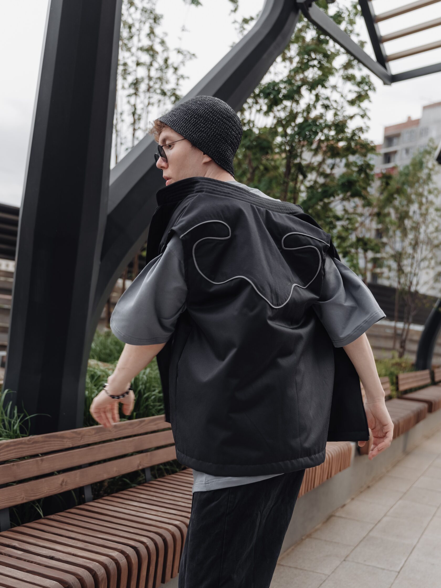 Мужской камзол в котором нет ничего лишнего. Сочетает минимализм и отсылки к традиционному костюму в виде стеганных, фактурных деталей, воротника-стойки и элемента орнамент на спине.