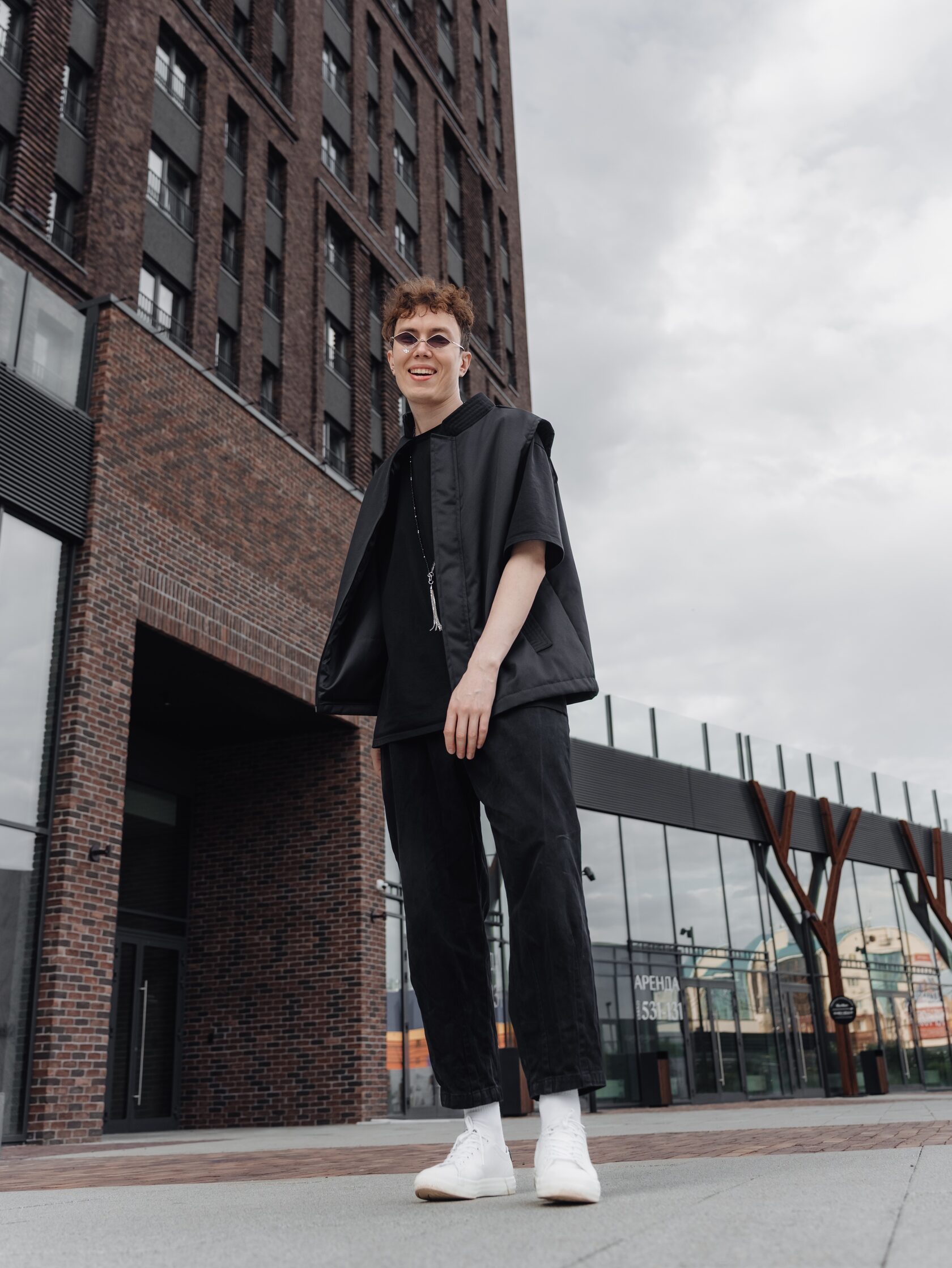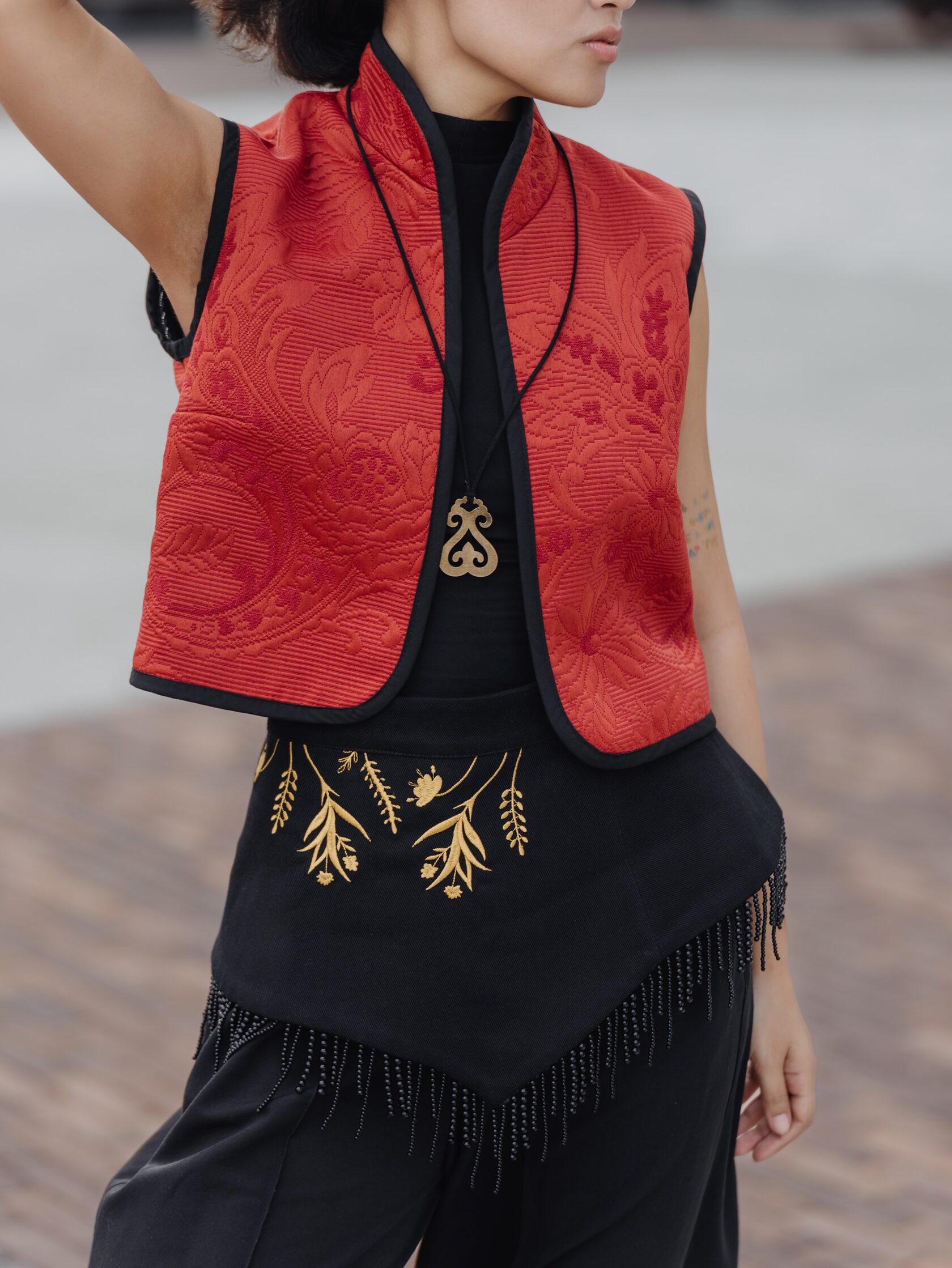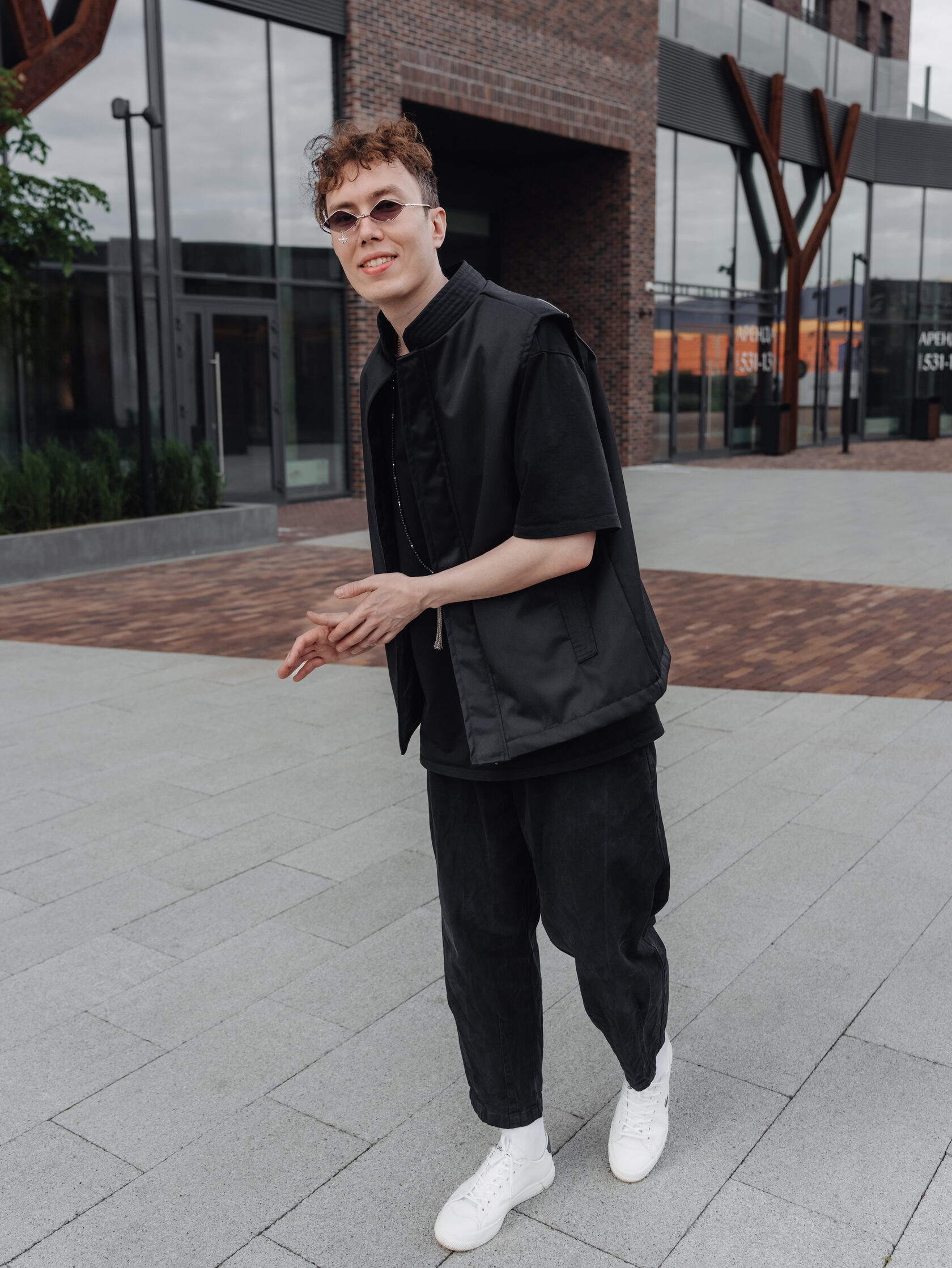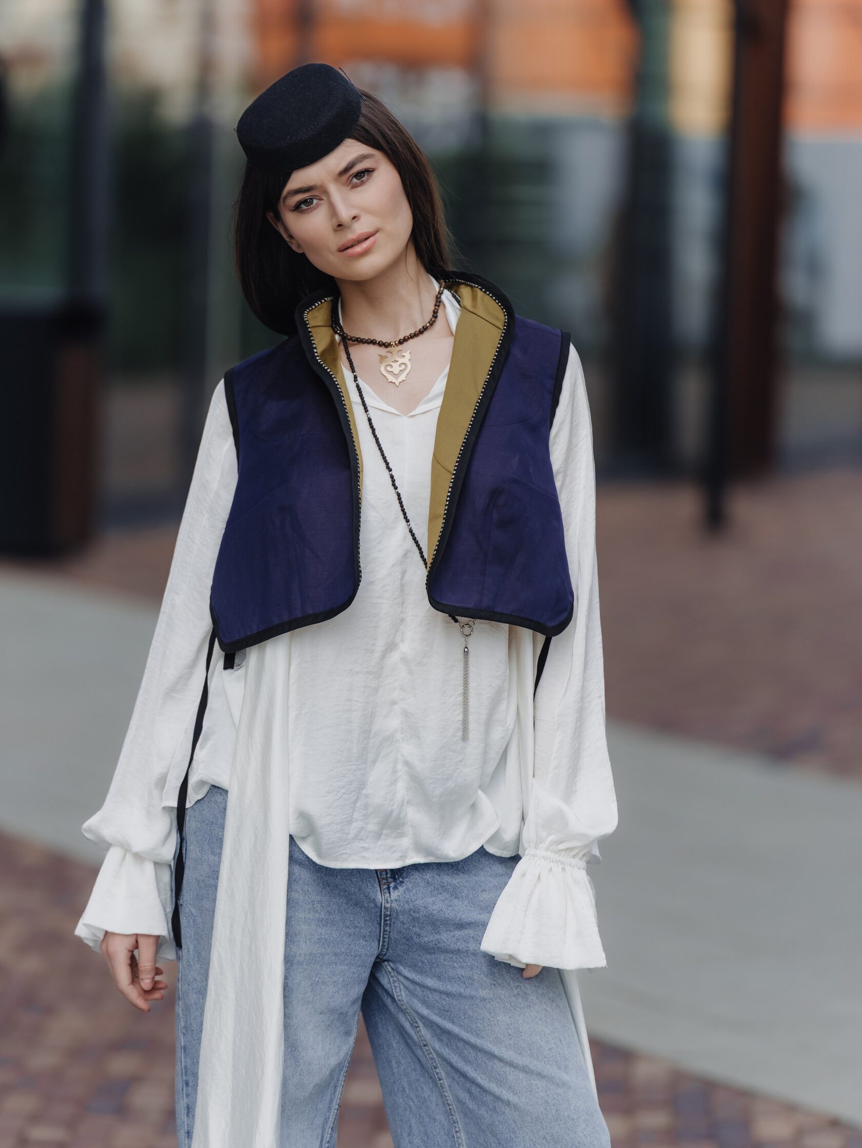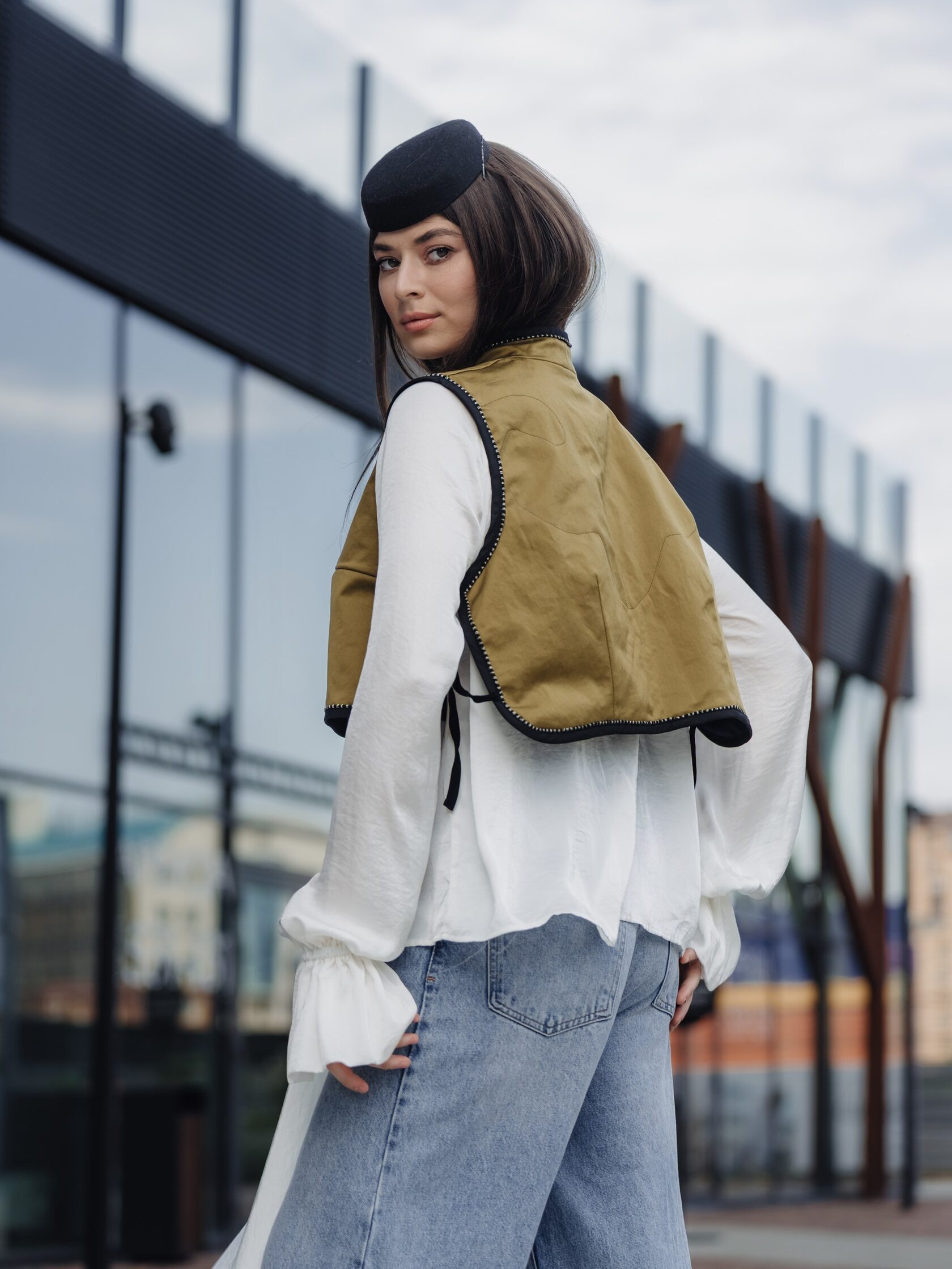 Мужской камзол в котором нет ничего лишнего. Сочетает минимализм и отсылки к традиционному костюму в виде стеганных, фактурных деталей, воротника-стойки и элемента орнамент на спине.